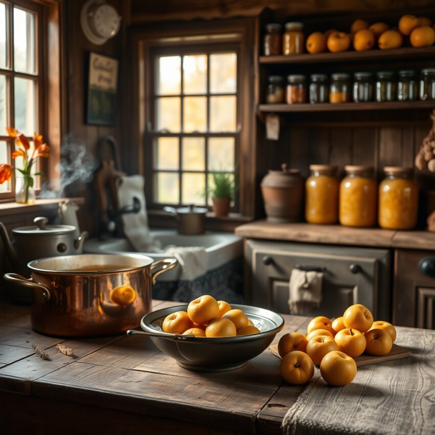 Everyday examples make this older kitchen culture even clearer. A small glass dish of quince jam at breakfast was not merely a sweet accompaniment to bread, but also a sign that the house had prepared itself well. Serving it to guests, offering it to someone unwell to restore appetite, or sending a jar next door showed that it held a social meaning extending beyond the kitchen. Its bright color, the translucent slices, and the heavy way it flowed onto a spoon also brought visual richness into the home. Jars lined up on a pantry shelf stood like quiet emblems of labor and of a household that had managed to meet the season in time.