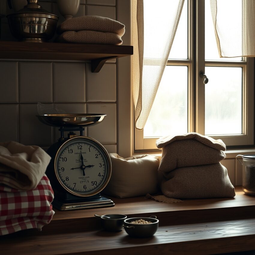Some objects occupy a deep place in domestic memory not only because they were used, but because they became visible again at particular times. The old scale belongs to this group. On ordinary days, it might stand quietly on a pantry shelf, in the cool storage room, or in the upper part of a cupboard. Yet when holiday cleaning arrived, it emerged once more, had its dust removed, its brass or metal face polished, and was placed again in a visible position as if to remind the household of an older seriousness. Its renewed shine signaled not only the care of the object, but the refreshing of domestic order itself.