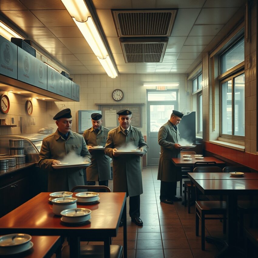 Perto do meio-dia, o mesmo som corria pelos corredores das repartições: gavetas fechando, canetas sobre a mesa, paletós saindo do encosto da cadeira. Saindo do cheiro de papel e carimbo, os funcionários seguiam para o restaurante popular da cidade, caminho já decorado no corpo. Da porta entreaberta vinham o vapor da sopa de lentilha, o aroma de pão fresco e o choque metálico das bandejas. Aquele intervalo curto não era só refeição; era entrada no ritmo coletivo do almoço urbano.