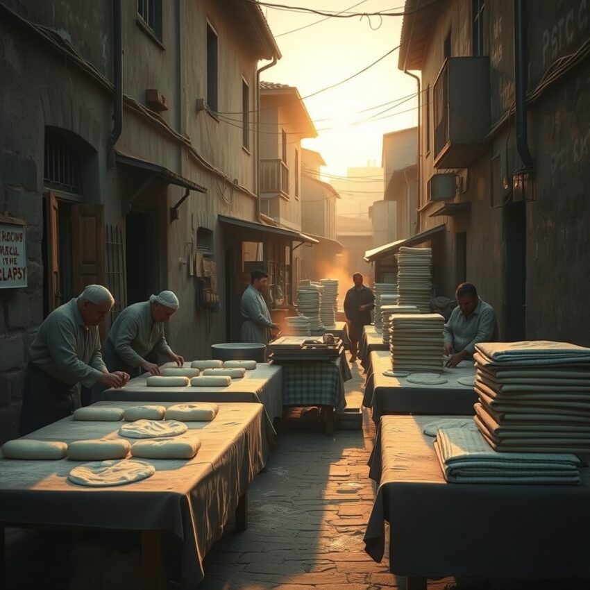 Em alguns bairros, certas manhãs começavam antes de o dia clarear por completo. O portão do pátio abria, panos eram estendidos no chão, farinha era espalhada e o som do rolo batia nas paredes. Os dias de abrir yufka não eram só preparo de comida; eram horas rituais de cooperação. O que começava no pátio de uma casa logo mudava o ritmo de toda a rua. Crianças ainda sonolentas levavam água, adultos dividiam a massa, e as bandejas para o forno eram contadas com cuidado.