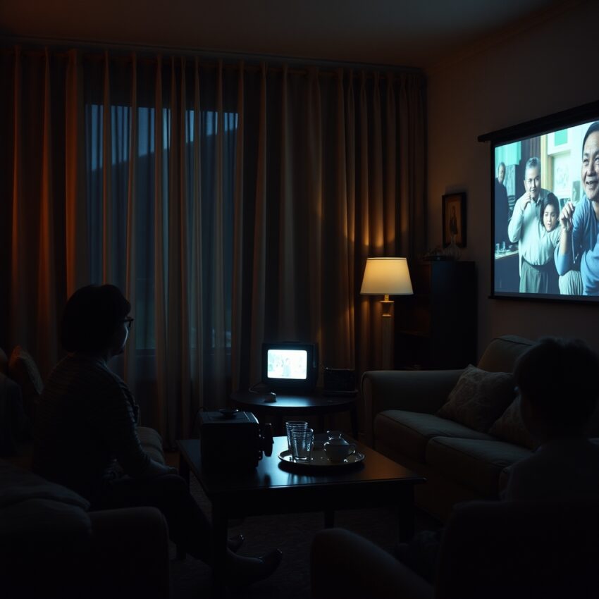 The ritual was closely tied to the arrangement of the room itself. The coffee table was moved, children were warned not to step on the cables, sometimes a white sheet was stretched across a wall, and sometimes the cream-colored curtain became the screen. People sat with tea, fruit, or sunflower seeds and did more than watch images. They practiced remembering together. Someone would say, “That was your first school trip,” while someone else supplied a detail outside the frame, widening the scene all at once. The image stayed fixed on the wall, but the story expanded inside the room.
