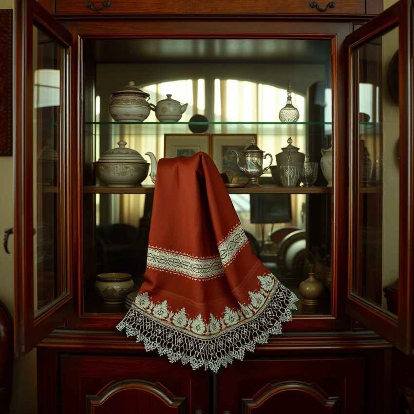 In many homes of the past, entering the guest room meant your eyes immediately met the most visible shelf of the display cabinet. Behind glass sat lace-trimmed cloths, carefully arranged tea sets, small crystal pieces, and often a neatly folded embroidered headscarf bundle. This composition was never random. Each item carried a trace of family history, a woman’s labor, or a memory from a special day. The cabinet was less storage and more a quiet exhibition where the home narrated itself.