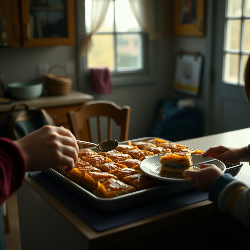 Its meaning also grows through collective labor. One person arranges walnuts, another carries the sheets, another brushes butter, another slides the tray into the oven with care. Children may remain spectators during preparation, yet they become natural partners in the excitement that follows. The first spoon after school is therefore not only a sign of hunger. It is the meeting point between the morning’s effort in the kitchen and the child returning home. The joy in that first bite comes not only from sweetness, but from the security of knowing that something in the house was made together.