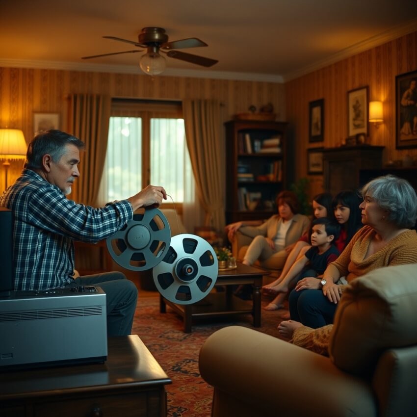 Pelo olhar de legado tecnológico, essa cena mostra que aparelhos analógicos faziam mais do que exibir conteúdo; eles organizavam a percepção do tempo em família. Colocar o filme, alinhar o rolo, ajustar luz e áudio raramente era tarefa solitária. Um fechava a cortina, outro testava a tomada, outro lembrava: “com cuidado para não riscar.” O uso da tecnologia era trabalho compartilhado, não consumo passivo.