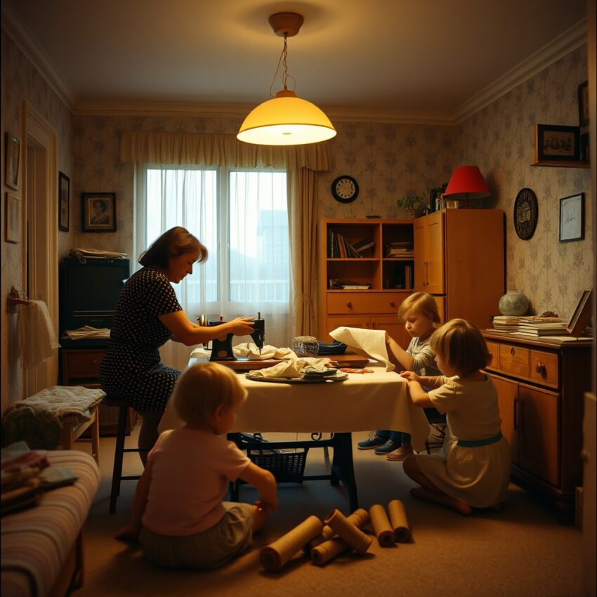 This practice truly turned streets into shared homes because doors were knocked not only for visiting, but for making. One house had an iron ready, another lent a buttonhole foot, another hosted children playing with thread spools while adults discussed fit and style. While talking about hem length, people also discussed school costs, wedding dates, and a sick neighbor’s condition. Sewing became a point where economic thrift and social care met.