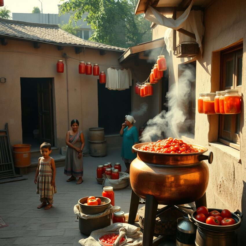 The ritual also produced neighborhood solidarity. When one household set up a cauldron, others sent cheesecloth, lent empty jars, or called an experienced neighbor to judge consistency. Covering rooftop trays with thin cloth, bringing them in at evening cool, setting them out again next day became shared tasks. Tomato paste thus created not only palate memory but community memory. The same aroma moved through several streets, generating shared seasonal awareness across the city.